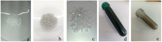 (a) Virgin PET granules; (b) recycled PET granules; (c) recycled PET flakes (d) preform 50% vPET/50% rPET; (e) preform 100% rPET.
