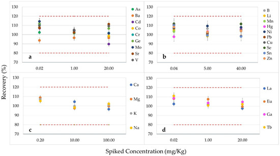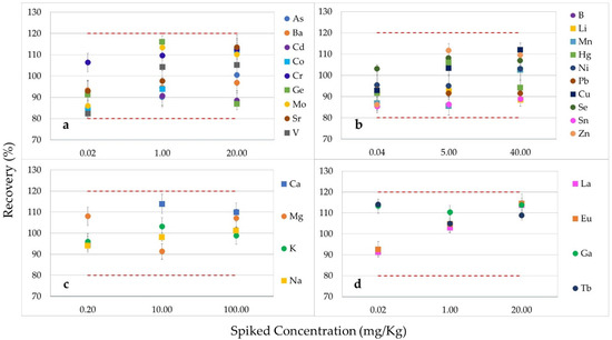 The linearity was determined by evaluating the correlation between different analyte concentrations and their corresponding instrumental responses. In detail, calibration standards for 26 HMs (Al, Sb, As, Ba, B, Cd, Ca, Co, Cr, Fe, Ge, Li, Mg, Mn, Hg, Mo, Ni, Pb, K, Cu, Se, Na, Sn, Sr, V, and Zn) and 4 REEs (La, Eu, Ga, and Tb) were prepared and analyzed using ICP-MS. For instance, for Al and Fe, concentrations of 0.5, 1.0, 2.5, 5.0, 25.0, 50.0, 100.0, and 200.0 µg/L and of 0.1, 0.5, 1.0, 2.5, 5.0, 25.0, 50.0, 100.0, 250.0, and 500.0 for Sb were utilized. Furthermore, for As, Ba, Cd, Co, Cr, Ge, Mo, Sr, and V, linear ranges were evaluated through 8 calibration points (0.1, 0.5, 1.0, 2.5, 5.0, 25.0, 50.0, and 100.0 µg/L), while 9 calibration points were used for B, Li, Mn, Hg, Ni, Pb, Cu, Se, Sn, and Zn (0.2, 0.5, 1.0, 2.5, 5.0, 25.0, 50.0, 100.0, and 200.0 µg/L). For the remaining analytes, the curves were constructed using 8 calibration points (0.1, 0.5, 1.0, 2.5, 5.0, 25.0, 50.0, and 100.0 µg/L for La, Eu, Gd, and Tb and 1.0, 2.5, 5.0, 25.0, 50.0, 100.0, 250.0, and 500.0 µg/L for Ca, Mg, K, and Na). As shown in Table 2, for all analytes, the correlation coefficients (R2) met the acceptability criteria (>0.990). These results indicated the linearity of the method within the measurement ranges. Additionally, Table 2 also provides the LOD and the LOQ obtained for the studied analytes. The LOD and the LOQ were in the range of 0.006–0.030 mg/kg and 0.02–0.20 mg/kg, respectively. Some spectra obtained from the instrumental analysis and the graphical recovery of IS are provided in the Supplementary Material (Figures S1–S5).
