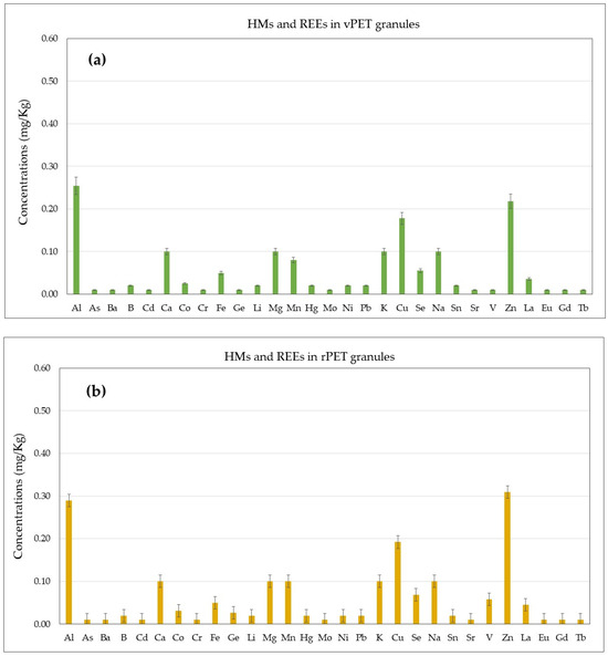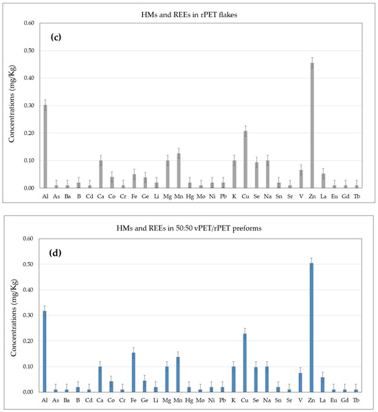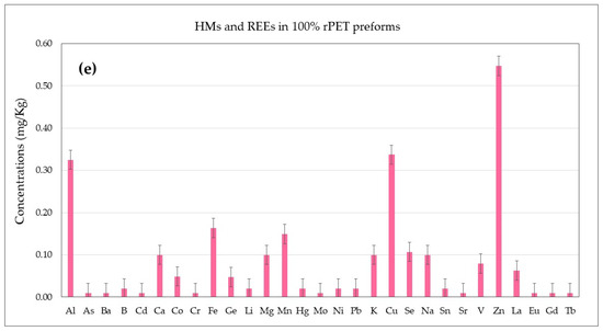 The developed method has been utilized to quantify 26 HMs and 4 REEs in PET and rPET samples (Figure 1). The results are shown in Figure 4. In detail, Figure 4 illustrates the concentrations of HMs and REEs (mg/kg) found in vPET granules (Figure 4a), rPET granules (Figure 4b), rPET flakes (Figure 4c), 50:50 vPET/rPET preforms (Figure 4d), and 100% rPET preforms (Figure 4e).
