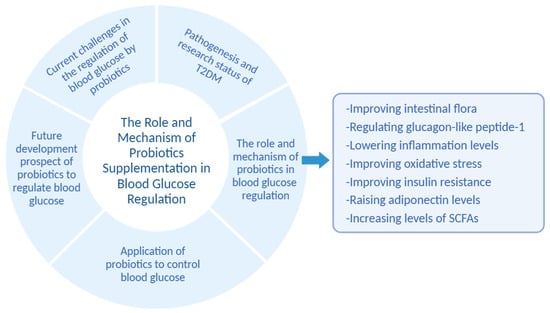 This paper reviews the mechanism of action, application, development trend, prospects, and challenges of probiotics in regulating T2DM, with a view to providing a theoretical basis for the development of microecological agents for regulating blood glucose (Figure 2).