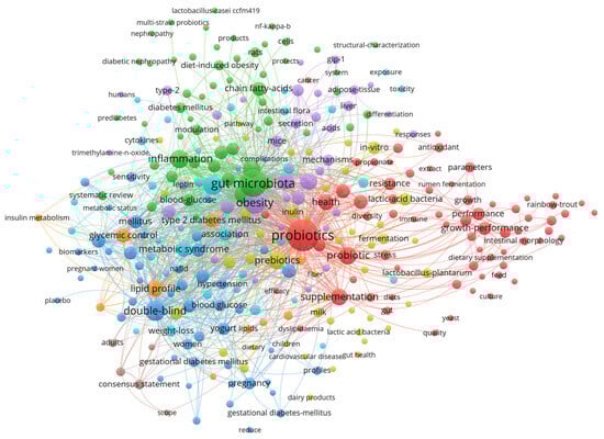 Keyword co-occurrence network diagram of published articles that focused on probiotics and blood glucose (2014–2024).