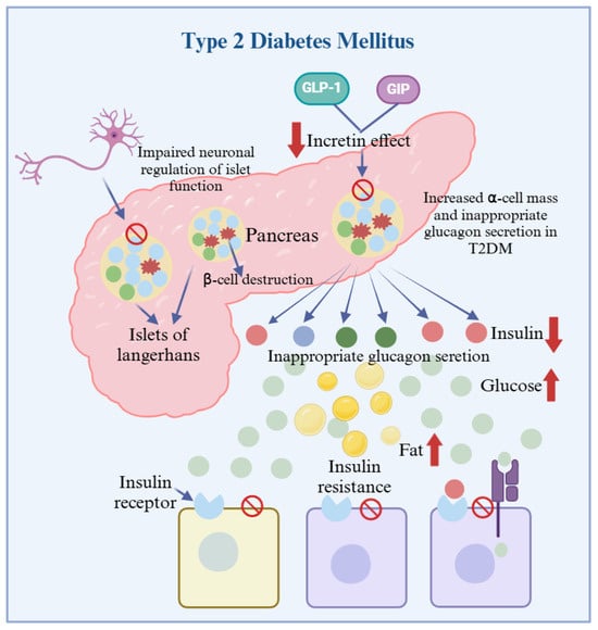 As we all know, diabetes is a chronic metabolic disease that occurs when the body cannot effectively use or produce insulin. The typical feature of diabetes mellitus is that the body cannot maintain normal blood sugar levels, mainly manifested as irritable thirst, excessive eating, polyuria, weight loss, and so on [43]. This chronic metabolic disorder has become a global health problem due to the severe harm it causes to human health [44]. Accelerated urbanization, aging, and lifestyle changes have led to an increase in the rate of obesity, which in turn increases the prevalence of diabetes mellitus and cardiovascular diseases [45]. T2DM is considered as an intestinal disorder that predominates in diabetic patients and is mainly caused by disturbances in glucose metabolism regulated by pancreatic β-cells [46]. Insulin is a peptide hormone secreted by the pancreas by the β-cells which regulates the uptake of glucose in the corpuscular circulation by activating hepatocytes and myocytes as a source of energy or by storing it in the form of glycogen in hepatocytes or skeletal muscle cells. Due to insulin resistance, reduced insulin receptor function and instability of pancreatic β-cells result in the inability of the cells to take up blood glucose, which in turn leads to T2DM [47] (Figure 5). In addition to this, during the formation as well as development of diabetes mellitus, dysbiosis of intestinal flora and endotoxins produced by harmful flora further trigger inflammatory response, oxidative stress, and destruction of pancreatic β-cells leading to T2DM and complications.