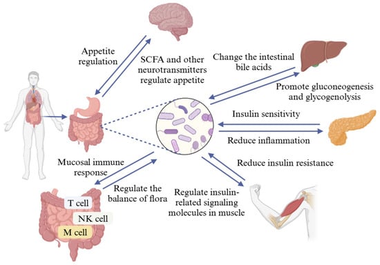 Probiotics can improve insulin sensitivity in patients. The binding of SCFAs produced by them to their receptors can significantly reduce fasting blood glucose, fasting plasma insulin, and insulin resistance index levels. In addition, mixed probiotic supplementation can reduce hepatic transaminases and insulin resistance levels, among others [92,98]. Siebler et al. [99] demonstrated that oral administration of Bifidobacterium bifidum reduced intestinal endotoxin concentration, improved glucose tolerance, and alleviated insulin resistance in an animal model, thereby regulating blood glucose.