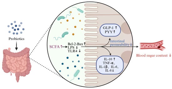 Probiotics relieve blood glucose levels by regulating SCFAs. SCFAs can induce L-cells to secrete GLP-1 and PYY, and promote insulin secretion to relieve T2DM. In addition, SFCAs reduce the level of inflammatory factors through intestinal epithelial cells, thereby reducing blood sugar content.