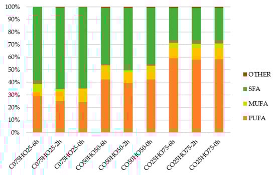 HOs are primarily composed of PUFAs (more than 70%), as represented in Figure 1. The majority of PUFAs are from the n-6 and n-3 families [48].