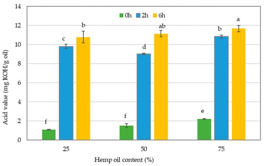 The acid value of oil blends without interesterification and after 2 or 6 h of interesterification. The different lowercase letters indicate significantly different values (p ≤ 0.05). Data are presented as mean values followed by the standard deviation (±SD).