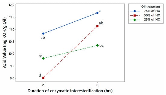 Interaction plot for the acid value of the blended oil samples (two-factor factorial, means denoted by distinct letters are significantly different).