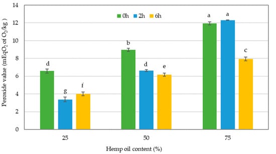 The results indicated that there was a considerable reduction in the PV of oil blends that contained 25% and 50% HO after 2 and 6 h of interesterification compared to the non-interesterified blends consisting of the same ratio of HO and CO. However, there was a significant reduction in the PV in oil blends that contained 75% HO, only at 6 h of interesterification compared to the non-interesterified oil blends with the same oil ratio. The PV for HO and CO was 13.82 and 4.12 mEqO2/kg, respectively. The presence of higher levels of HO in oil blends has been found to cause a significant increase in the PV of the resulting oils, which is a clear indication of accelerated oxidation. A considerable amount of chlorophyll in hemp seed is extracted during the pressing of hemp seed for oil extraction. As a photosensitive pigment, chlorophyll undergoes photo-oxidation, leading to rancidity and the quality deterioration of HO, which therefore necessitates storage in dark or opaque bottles [15,47].The PV limit for vegetable oils was set at 15 mEqO2/kg of oil in accordance with the codex standards [39]. Accordingly, all of the oil sample results from the present study recorded a lower PV compared to the codex limits of vegetable oils.