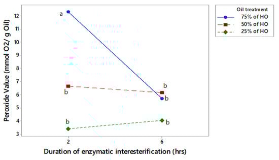 As indicated in the interaction plot presented in Figure 5, the interaction effect of the two factors, the proportion of the two types of oils included in the blend and the duration of enzymatic interesterification, were found to be significant on the PV of the oil blends that underwent enzymatic interesterification. Based on the interaction plot, the oil blend, which comprised 75% HO and was enzymatically interesterified for 2 h, showed a significantly higher PV while the interaction effects of all others were not significantly different from each other. The study findings suggest that a longer interesterification time (enzyme reaction time) can cause a distinct alteration in the arrangement of FAs in TAG molecules, despite the constant concentration of the oil blend. Moreover, the results indicate that for oil blends with a higher PUFA concentration, a longer interesterification time is preferable to reduce the PV for oil blends with higher PUFA concentrations. Yazdi and Alemzadeh [42] reported a reduction in PV after the enzymatic reaction, which supports our findings. The decrease in PV was due to peroxide binding with the enzyme protein. Therefore, our results suggest that prolonging the enzyme reaction time with the oil could further enhance this phenomenon (reaction time) and can cause a distinct alteration in the arrangement of FAs in TAG molecules, despite the constant concentration of the oil blend.