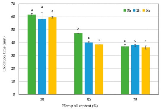 In oil stability analysis, the longer the oxidation time, the greater the oxidative stability of the oil. Moreover, the rate of the oxidation process depends on the presence of antioxidants or pro-oxidants [35].