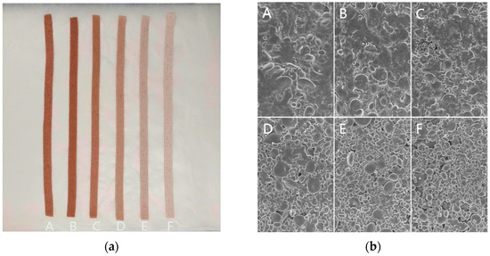 Photographs of triticale noodles with different levels of HMT-HAS: (a) macro images; (b) SEM micrographs. The levels of HMT-HAS are 0% (A), 10% (B), 20% (C), 30% (D), 40% (E), and 50% (F).