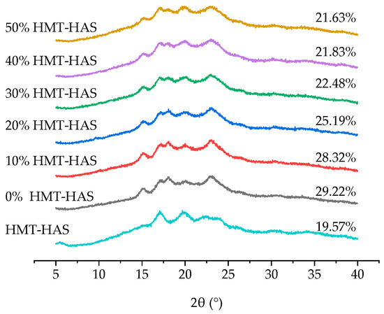 The X-ray diffraction patterns and relative crystallinity of the triticale noodles with different levels of HMT-HAS are displayed in Figure 3. The crystalline structure of starch generally includes three main types (A-, B-, and C-type) on the basis of their characteristics and X-ray diffraction patterns [34]. Triticale starch exhibited a typical A-type crystalline structure, with diffraction peaks at 15°, 17°, 18°, and 23° (2θ), whereas HMT-HAS showed single peaks at 5.6°, 15°, and 17° and a merging of doublet at 22° and 24°, still exhibiting a B-type structure, although partly changed by HMT. Additionally, HMT-HAS showed a peak at 20°, indicating the presence of a V-type crystalline structure. Undoubtedly, after the addition of HMT-HAS, a prominent V-type diffraction peak appeared at 20°. Moreover, with the level of HMT-HAS increasing, the peak became more pronounced, indicating an increase in the content of amylose–lipid complexes [35]. Due to the increasing level of HMT-HAS, the content of amylose in the noodles increased, and the amorphous region expanded. Consequently, the relative crystallinity decreased from 29.22% to 21.63%.