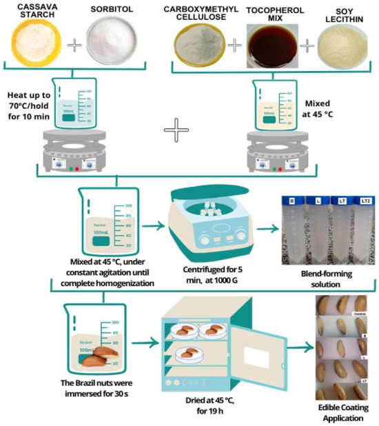 The edible coatings were prepared using the methodology of Tongdeesoontorn et al. [27] and Wu et al. [28]. Laboratory pre-tests were used to define the formulations. Four formulations called B, L, LT, and LT2 were prepared. Fixed amounts of cassava starch + carboxymethyl cellulose + sorbitol and water were used (3 g + 1.5 g + 0.2 g + 100 g, respectively), and the soy lecithin was added in the proportion of 20% to the tocopherol mix in the formulation L, LT, and LT2. The formulation L was prepared with the same amount of lecithin as LT2. The amount of tocopherol mix was added to the blends in the following proportions: B—0, L—0, LT—0.0005 g, and LT2—0.010 g. For the preparation of edible coatings (Figure 1), the solution of cassava starch, sorbitol, and 70% of the total volume of water was stirred (Quimis Q261-22, Diadema, SP, Brazil), raising the temperature to 70 °C, and maintained for 10 min to induce the gelatinization of the starch to form a paste. In another container, the carboxymethyl cellulose, the tocopherol mix, soy lecithin, and 30% of the total volume of water were mixed at 45 °C, and the starch paste was added to this mixture under constant agitation until complete homogenization to form a blend. The blends were subjected to centrifugation in a centrifuge (Quimis Q222, Diadema, SP, Brazil) for 5 min at 1000 G to remove air bubbles and stored until the moment of application, reserving part of the solution for the viscosity, centrifugation, creaming, pH, and antioxidant activity tests.