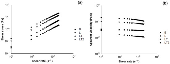 Figure 2a shows that the blend-forming solutions B, L, LT, and LT2 continuously increased shear stress according to the increase in the strain rate in all solutions; this behavior is characteristic of non-Newtonian fluids. The increase in the strain rate may have caused a collapse in the solutions’ structure, leading to a more aligned arrangement of the molecules [40].