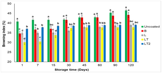 The loss of fresh mass for nuts is a limiting factor for their preservation and marketing, as the nuts have a dry/shriveled appearance and consequently losses that can be in nutritional aspects, on the oxidative level of the nut. Figure 4 shows the loss of fresh mass of Brazil nuts uncoated and with coating of the cassava starch/CMC control B (no soy lecithin and no tocopherol mix), L (with soy lecithin and no tocopherol mix), and LT and LT2 (with soy lecithin and tocopherol mix) during storage time.