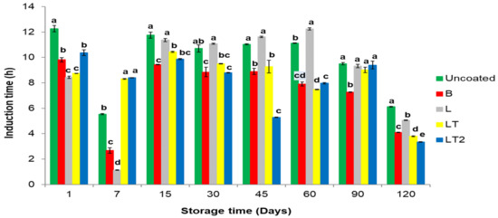 These results show that all the coatings applied to the Brazil nuts promoted the preservation of the samples in some of the evaluation periods. They also showed that most of the oxidative indices negatively influenced all the coated samples, especially the Brazil nuts coated with LT and LT2 coatings, which contained the tocopherol mix in their composition. That is an advantage, as it shows that the coatings generally protected the coated Brazil nuts, especially the Brazil nuts coated with LT and LT2.