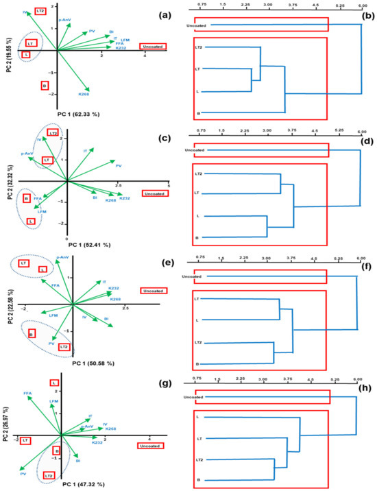 Figure 7 shows the biplot graphic of principal component analysis (PCA) and hierarchical cluster (HCA) of properties of the evaluation of the oxidation level of Brazil nuts uncoated and coated with coating of the cassava starch/CMC control B (no soy lecithin and no tocopherol mix), L (with soy lecithin and no tocopherol mix), and LT and LT2 (with soy lecithin and tocopherol mix) during storage time.