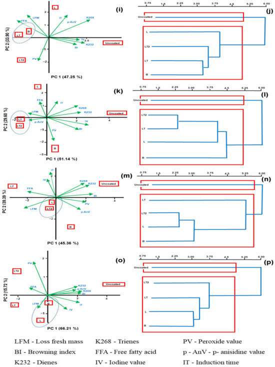 Biplot graphic of principal component analysis (a,c,e,g,i,k,m,o) on each storage day (1, 7, 15, 30, 45, 60, 90, and 120 days, respectively), and hierarchical cluster (b,d,f,h,j,l,n,p) on each storage day (1, 7, 15, 30, 45, 60, 90, and 120 days, respectively) of properties of the evaluation of the oxidation level of Brazil nuts uncoated and coated with coating of the cassava starch/CMC control B (no soy lecithin and no tocopherol mix), L (with soy lecithin and no tocopherol mix), and LT and LT2 (with soy lecithin and tocopherol mix) during storage time.