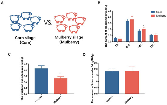 Mulberry and corn silage feeding experiment. (A) Feeding schematic diagram; (B) blood lipid content, high-density lipoprotein (HDL), low-density lipoprotein (LDL), and total cholesterol (CHO); (C) the weight of subcutaneous fat; (D) the content of intramuscular fat content. * p < 0.05, ** p < 0.01.
