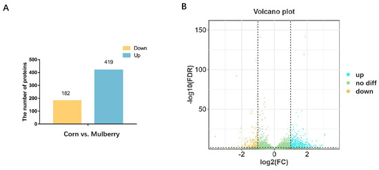 Bar chart (A) and volcanic map (B) of differential proteins.