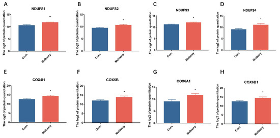 Differential proteins related to ROS in the proteome between corn silage and mulberry silage. (A–H): Protein expression levels of NDUFS1, NDUFS2, NDUFS3, NDUFS4, COX4L1, COX5B, COX6A1 and COX6B1. * p < 0.05; ** p < 0.01.