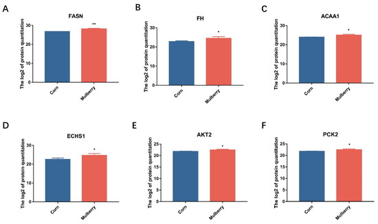 PRM validation of differential proteins between corn silage and mulberry silage. (A–F): Protein expression levels of FASN, FH, ACAA1, ECHS1, AKT2, and PCK2. * p < 0.05; ** p < 0.01.