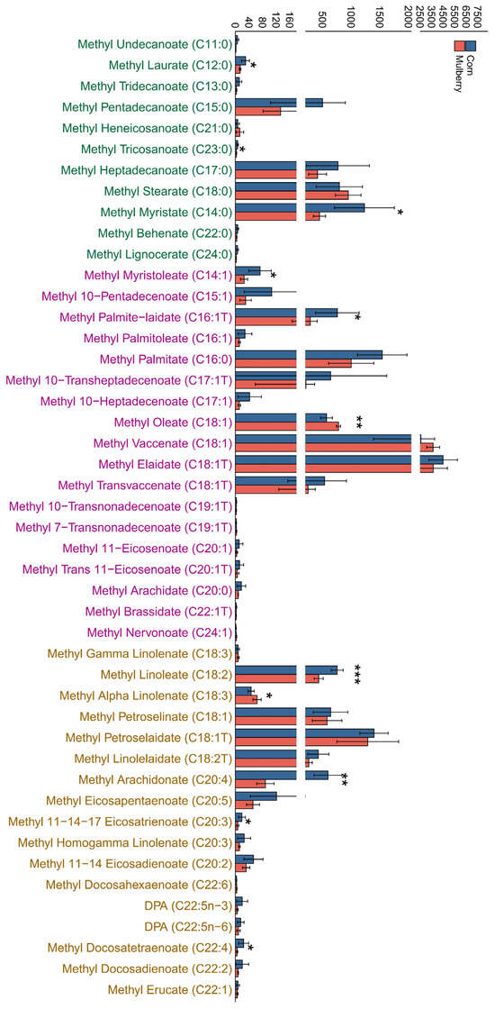 The content of long-chain fatty acids in adipose tissue of lambs fed corn silage and mulberry silage. * p < 0.05; ** p < 0.01; *** p < 0.001.