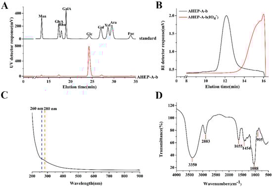 As shown in Figure 1C, UV absorption peaks were absent at 260 nm and 280 nm, indicating that AHEP-A-b does not contain nucleic acids or proteins and is a high-purity polysaccharide.