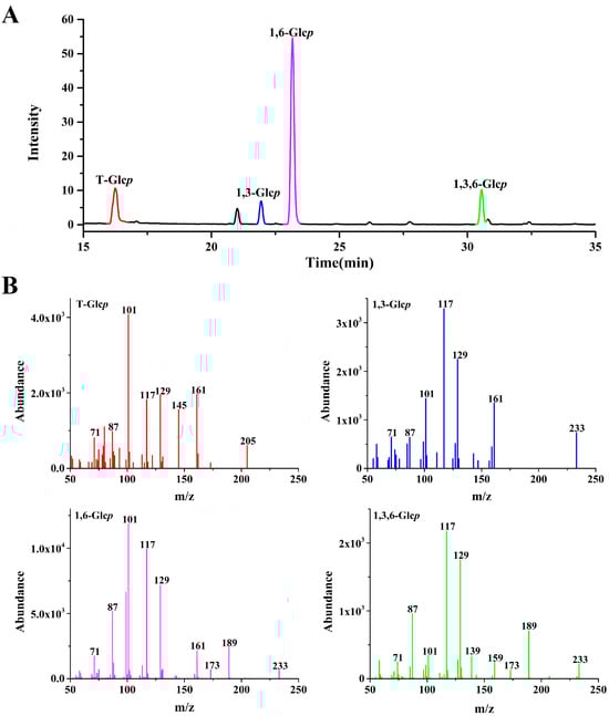 Methylation analysis was performed to determine the glycosidic linkage in AHEP-A-b, which contains a minimal amount of glucuronic acid that was not reduced in advance. AHEP-A-b was methylated, hydrolyzed and acetylated, followed by GC–MS analysis to deduce the amount of alditol acetate. The total ion chromatogram profiles and ion fragments of partially methylated alditol acetates (PMAAs) are shown in Figure 2. Table 1 shows that the glycosidic linkage of glucose in AHEP-A-b is in various forms, i.e., (1→6)-linked, (1→3,6)-linked, (1→3)-linked and terminal-linked. The (1→6)-linked (69.8%) and (1→3,6)-linked (11.7%) forms indicate that the backbone of AHEP-A-b is (1→6)-glucan, branched at O-3 (14.4%). The terminal glucose residue (10.3%) and (1→3)-linked glucose (8.2%) may be present as side chains linked to the backbone.