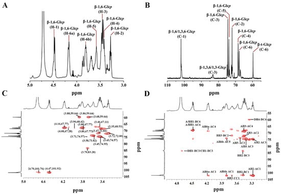 NMR spectra of H. erinaceus polysaccharide AHEP-A-b. (A) 1H NMR spectrum. (B) 13C NMR spectrum. (C) HSQC spectrum. (D) HMBC spectrum.