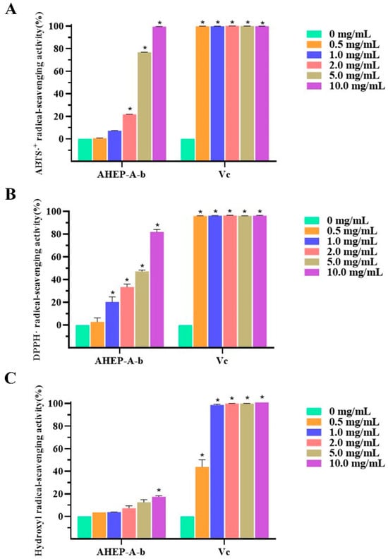Antioxidant activity of AHEP-A-b. (A) Scavenging ABTS·+ radical. (B) Scavenging DPPH·. (C) Scavenging hydroxyl radical (•OH-). Vc is the positive control. Data are shown as the mean ± SD, (n = 3, *: p < 0.05). All experiments were performed in triplicate.