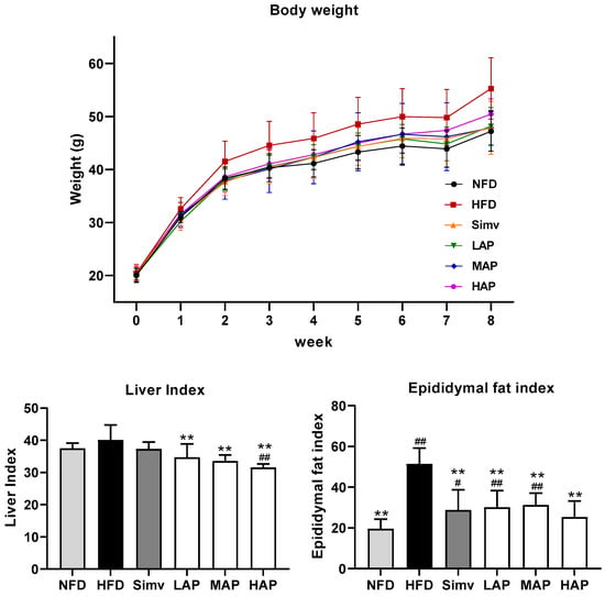 As shown in Figure 1, the results of the BW dynamics of gavage for 8 weeks showed no difference in the initial BW of all groups, and the BW of the model group was significantly higher than that of the control group after 2 weeks of high-fat-diet feeding. The BW of the simvastatin group was close to that of the control group, and the BW of each AP treatment group was between that of the model and control groups. With the extension in gavage time, the effect of AP in controlling BW became more obvious. Compared with the BW of the model group, the BW of mice in the LAP and MAP groups was significantly reduced, and the control effect was close to that of the Simv group. The results showed that the liver index of mice fed with a high-fat diet had a tendency to increase, and compared with the liver index of the model group, the effect of AP showed a significant decrease in the liver index, with a decline of 13.40%. The epididymal fat index in the model group increased extremely significantly by 1.68 times compared with the control group. The epididymal fat index of AP was significantly reduced by 39.23% in the high-fat mice. The effect of reducing liver index and epididymal fat was close to that of the simvastatin group. The disorder of glucose and lipid metabolism caused by a high-fat diet is usually accompanied by significant obesity. Increased obesity promotes inflammation and oxidative stress, thereby promoting the development of hyperglycemia and hyperlipidemia [20]. AP significantly reduced the body weight of high-fat mice, significantly ameliorated the severity of epididymal and liver fat accumulation in mice, and had a certain anti-obesity effect. Similar results were found in a study using A. auricula powder to prevent obesity. Specifically, A. auricula powder replaced part of the diet to significantly reduce the body weight, liver index, and epididymal fat index in high-fat-diet-induced nutritional obesity model mice [21].