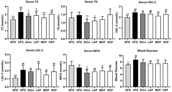 Compared with the control group, serum TC and LDL-C were higher in the model group (p < 0.01), and TG tended to increase, indicating the model’s success. Compared with the model group, serum TC, TG, and NEFA were lower (p < 0.05) in the Simv group, TC and TG were lower in the LAP group (p < 0.05), and TC was significantly lower in the MAP group (p < 0.01). The results indicate that AP can reduce TC and TG. Compared with the fasting blood glucose (FBG) of the control group of 7.12 mmoL L−1, that of the model group of 8.69 mmoL L−1 was highly significantly increased after feeding the high-fat diet for 8 weeks. Compared with the model group, all AP treatment groups showed highly significantly reduced FBG (p < 0.01), and its effect was significantly better than that of the Simv group (Figure 2). Our findings align with those reported by Zhang [22], who developed an obesity model in male C57BL/6 mice using a high-fat diet. A subsequent intervention with 200 mg kg−1 of AP notably decreased both serum TG level and blood glucose concentration.