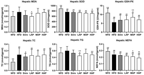 In Figure 3, compared with the control group, the activity of hepatic SOD and GSH-PX was lower (p < 0.01), and the content of MDA only showed an increasing trend in the model group. Compared with the model group, the hepatic MDA was significantly lower in the LAP group, and the activity of hepatic GSH-PX increased dramatically in the MAP group. This indicates that AP had antioxidant activity that increased GSH-PX activity and decreased MDA content. The hepatic TC of the model mice was higher, while hepatic NEFA was lower than normal mice (p < 0.01). The hepatic TG of mice in the LAP and HAP groups was significantly lower, and the liver NEFA of mice in the MAP and HAP groups was considerably lower than that in the HFD group. The liver is an essential organ for lipid metabolism, including fat uptake, oxidation, synthesis, and secretion. Under normal circumstances, liver lipid metabolism maintains a dynamic balance. Excessive intake of lipids in a high-fat diet exceeds the liver’s ability to oxidize, synthesize, and transport, leading to liver fat hepatic steatosis and inflammatory infiltration [23]. In addition, literature reports suggest that oxidative stress plays a vital role in hyperlipidemia, and that the antioxidant activity of polysaccharides is closely related to their lipid-lowering activity [24]. The above liver biochemical indicators confirm that AP has hepatoprotective and antioxidant functions, which are beneficial for improving hyperlipidemia. The results are consistent with previous studies that report AP as being effective at simultaneously increasing GSH-PX activity and reducing MDA levels in mice with type 2 diabetes, thereby ameliorating oxidative stress-related damage [25].