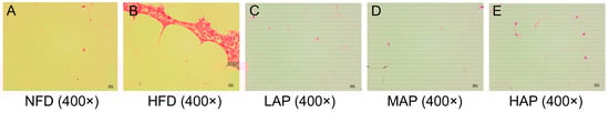 Using 400× HE stained sections (Figure 5), it was shown that liver cells in the NFD group were neatly arranged, with large and round nuclei in the center of the cells and clear cell borders. No lipid droplets were observed (lipid droplets were dissolved by ethanol and xylene during membrane formation, forming vacuoles) (Figure 5A). The liver cells in the HFD group were disordered, with circular vacuoles of varying sizes appearing in the cytoplasm. Some vacuoles were larger and squeezed the nucleus towards the edge, resulting in unclear cell boundaries and even fragmentation (Figure 5B). After LAP treatment, there was a slight amelioration in the morphology and structure of the liver cells (Figure 5C). The morphological improvement of liver cells was more significant in the MAP and HAP groups. The position of the cell nucleus was close to the center, and the cell border and vacuole area were significantly reduced (Figure 5D,E), which was consistent with the decrease in liver index (Figure 1).