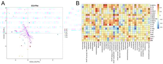 Environmental factor association analysis. (A) CCA analysis. (B) Heatmap of correlations between the top 35 gut microbiota taxa and environmental factors. Blue and red squares indicate negative and positive correlations, respectively. ** p < 0.01 and * p < 0.05 indicate that the difference was statistically significant.