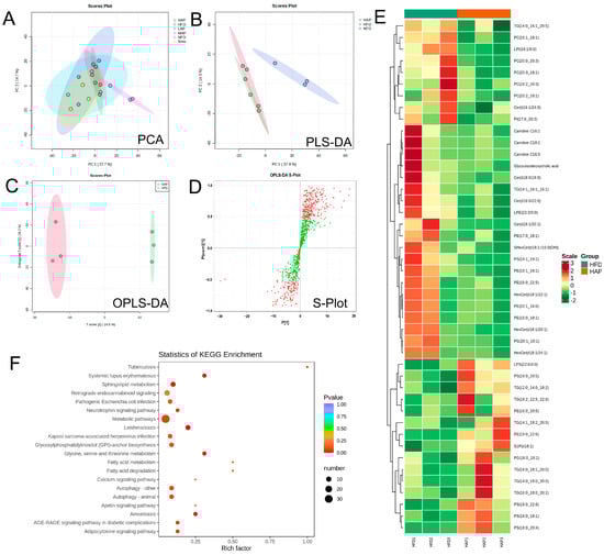 Serum widely targeted lipidomics analyzed with UPLC-ESI-MS/MS. (A) PCA; (B) PLS-DA; (C) OPLS-DA; (D) S-loading plot of OPLS-DA; (E) heatmap of significantly differential metabolites (VIP > 1.0, p < 0.05) between the model and HAP groups; (F) KEGG pathway analysis.