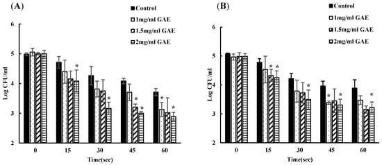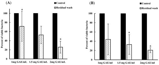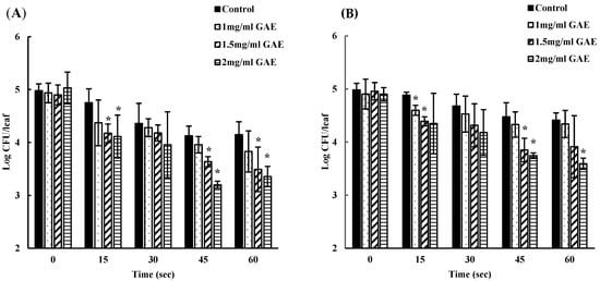 In addition, the bacterial content of the remaining wash solutions after four soaks of both spinach (Figure 2A) and lettuce (Figure 2B) was determined. The microbial load in the remaining water (control) was approximately 3 log CFU/mL, indicating 100% viable bacteria (Figure 2). The viable bacterial concentration observed in 1, 1.5, and 2 GAE mg/mL residual BPE water was expressed as the relative percentage of surviving bacteria compared to that of control. In spinach, aliquots of residual BPE water from treatments with 1, 1.5, and 2 GAE mg/mL showed a bacterial load of 71.5%, 52.69%, and 25.89%, respectively, relative to control. On the other hand, in lettuce washed with residual water, the viable bacteria counts were 44.08%, 32.95%, and 20.70% in 1, 1.5, and 2 GAE mg/mL BPE water solutions, respectively. The bacterial load in these treatment solutions was significantly lower compared to the control (p < 0.05).
