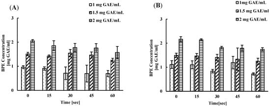 On the other hand, the lettuce wash resulted in a reduction in the phenolic concentration of BPE in water from 1 GAE mg/mL to 0.83, 0.83, 0.97, and 0.72 mg GAE/mL, respectively, at time points—15, 30, 45, and 60 s. Likewise, the concentration of phenolic compounds in BPE-containing water decreased from 1.5 GAE mg/mL to 1.46, 1.40, 1.33, and 1.25 GAE mg/mL at the same time points, while the concentration of phenolic compounds in 2.16 mg GAE /mL BPE water reduced to 2.14, 1.81, 1.79, and 1.74 GAE mg/mL at 15, 30, 45, and 60 s, respectively (Figure 4B). The reduction observed after each wash was not significant compared to the original concentration, which suggests that the number of washes does not affect much the reduction in the phenolic concentration of the BPE in water.