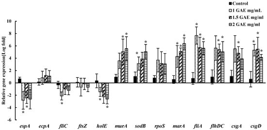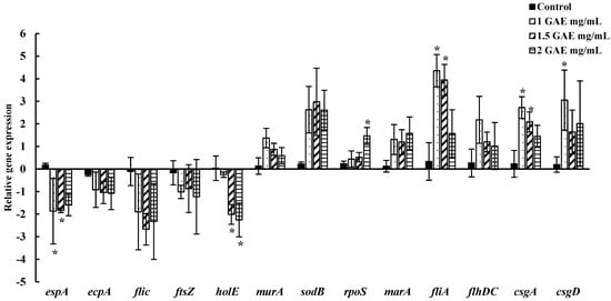 Changes in the relative expression of genes related to attachment, adhesion, biofilm formation, survival, and replication of EHEC EDL-933 were assessed following the 60 s wash in BPE. A quantitative real-time PCR was utilized to evaluate the levels of specific genes that were normalized using the 16S rRNA gene as a reference. The fold change values were calculated by comparing gene expression in bacteria treated with varying concentrations of BPE to that of the control group treated with water in both spinach (Figure 5) and lettuce (Figure 6). The relative expression of the genes responsible for attachment to surfaces and adhesion (espA, csgA, csgD, ecpA), biofilm formation and motility (fliC, fliA, flhDC), cell division and replication (murA, holE, ftsZ), and response against stress/antibiotics (rpoS, sodB, marA) due to BPE treatment were studied.