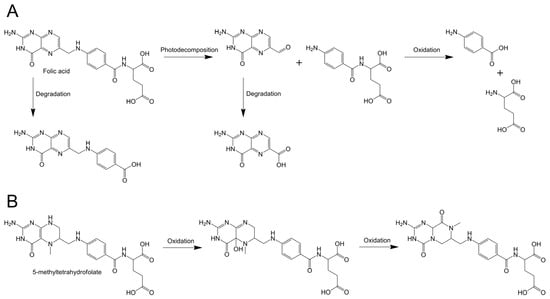 - Liu, Y.; Tomiuk, S.; Rozoy, E.; Simard, S.; Bazinet, L.; Green, T.; Kitts, D.D. Thermal oxidation studies on reduced folate, L-5-methyltetrahydrofolic acid (L-5-MTHF) and strategies for stabilization using food matrices. J. Food Sci. 2012, 77, C236–C243. [Google Scholar] [CrossRef]