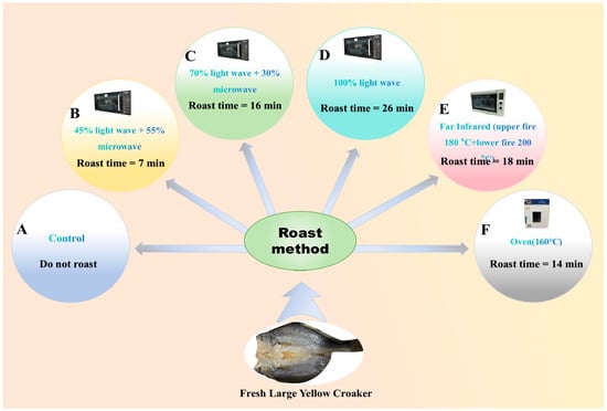 Fresh large yellow croakers of suitable size were selected as the raw materials. After slaughter, the gills, scales, and internal organs were removed. The fish were cut open along the back line and rinsed three to four times with clean water. After cleaning, the fish were placed in a pickling solution with 1.5% salt water. After pickling at 4 °C for 6 h, the fish were removed and rinsed with water, and the water was drained. All procedures were performed in accordance with the instructions of the World Organization for Animal Health (OIE) guidelines. It also complies with the ethical exemption requirements of the Measures for Ethics Review of Human Life Science and Medical Research issued by China. Based on the comprehensive sensory evaluation scores of the five roasting methods in the preliminary experiment, the parameters with the highest scores for each roasting method were selected and marked as groups A, B, C, D, E, and F. The specific optimal roasting parameters are presented in Figure 1. All samples of roasted large yellow croaker (20 g) up to 5 min after heat treatment were portioned to food-grade vacuum bags, then vacuum packaged, and encoded. Thereafter, they were placed in thermally insulated Styrofoam boxes to maintain the temperature (37 ± 1 °C) and delivered for evaluation.