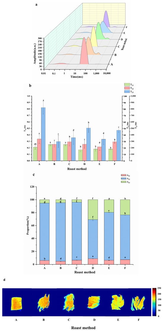The moisture content and moisture distribution of large yellow croaker prepared with different roasting methods. The plots in (a–d) represent the low-field nuclear magnetic resonance (LF-NMR) T2 relaxation time spectrum, the T distribution relaxation time distribution, the corresponding peak area ratio, and the nuclear magnetic resonance imaging pseudo-color map of different roasting methods of large yellow croaker fish, respectively. A–F represent different roasting methods. A—control, B—45% light wave and 55% microwave roasting, C—70% light wave and 30% microwave roasting, D—100% light wave roasting, E—far-infrared roasting, and F—oven roasting. Different lowercase letters (a–f) in the same parameter indicate significant differences between different roasting methods (p < 0.05). “a”, “b”, “c”, “d”, “e”, “f” represents a significant difference between the groups. “a” and “ab” contain the same letter “a”, indicating no significant difference between the two groups. “b” in “ab” indicates no significant difference between this group and other groups containing the letter “b”.