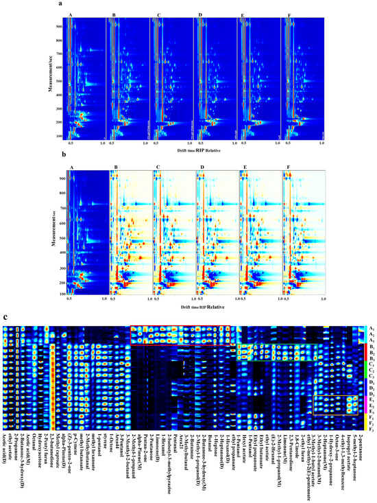 Volatile organic compounds in the roasted fish were identified using GC-IMS. Figure 3a,b show raw fish sample A as a reference. The difference spectrum was obtained by comparing the samples obtained using the five roasting methods. The x-axis represents the drift time of the ions, and the y-axis represents the gas chromatography retention time. The concentration below the reference is shown in blue, the concentration equal to the reference is shown in white, and the concentration higher than the reference is shown in red [49,50]. The comparison diagram shows that there were significant differences in the compounds among the five roasting methods.