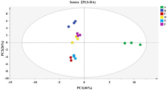Partial least squares discriminant analysis (PLS−DA) score plot of key volatile flavor compounds in large yellow croaker prepared using different roasting methods. A−F represent different roasting methods. A−control, B−45% light wave and 55% microwave roasting, C−70% light wave and 30% microwave roasting, D−100% light wave roasting, E—far-infrared roasting, and F−oven roasting.