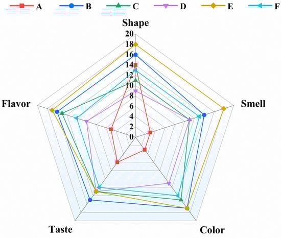 Radar chart of sensory evaluation scores for different methods of roasting large yellow croaker fish. A–F represent different roasting methods. A—Control, B—45% light wave and 55% microwave roasting, C—70% light wave and 30% microwave roasting, D—100% light wave roasting, E—far-infrared roasting, and F—oven roasting.