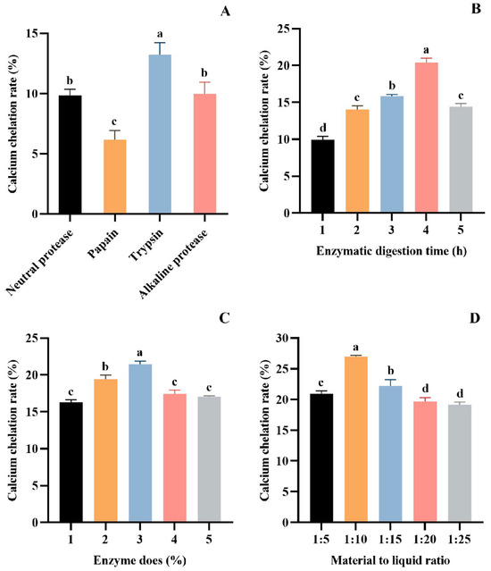 The protein hydrolysates obtained under different treatment conditions significantly affected the chelating ability of Ca [42,43]. Currently, the most effective method for obtaining bioactive peptides is enzymatic hydrolysis [44,45]. It has been shown that proper enzymatic hydrolysis promotes the exposure of hydrophilic groups and enhances Ca coordination, which can significantly increase the rate of Ca chelation [46]. In order to obtain the protein hydrolysate with the optimal chelation of calcium ions, the proteases were screened by Ca chelation rate as the index. The results showed that trypsin is the most suitable for preparing hydrolysate with the best Ca chelating effect (13.23 ± 0.99%) (p > 0.05), followed by alkaline protease (9.96 ± 0.98%), neutral protease (9.85 ± 0.50%), and papain (6.16 ± 0.77%) (Figure 1A). Therefore, trypsin was chosen as the experimental enzyme.