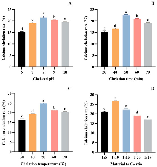 Effect of chelation pH (A), time (B), temperature (C), and material to Ca ratio (D) on the Ca chelation rate of the tuna meat hydrolysates. All the values are means ± SD (n = 3). a–e No significant difference between the same letters (p > 0.05).
