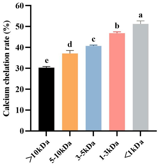 Molecular weight (MW) is the most important factor to consider for the separation of fractions with desired functional or biological properties from protein hydrolysates [49]. Ultrafiltration is a technique for separating molecules in solution based on molecular size, and it is widely used to concentrate target fractions from protein hydrolysates on a MWCO membrane [50]. Therefore, the defatted tuna meat powder was fully digested by trypsin under the optimized conditions, and the prepared hydrolysate was fractionated by ultrafiltration to obtain five fractions with molecular weights less than 1 kDa, between 1 and 3 kDa, between 3 and 5 kDa, between 5 and 10 kDa, and greater than 10 kDa, respectively. Five fractions were chelated with CaCl2, and then their Ca chelation rates were determined (Figure 3). The results showed that the Ca chelation rate of <1 kDa fraction was 51.27 ± 1.42% (p > 0.05), which was significantly higher than the other four fractions. This result indicated that small molecule peptides are more likely to bind with Ca2+ to generate peptide–Ca chelates. Therefore, the chelate of <1 kDa fraction and Ca2+ was named as TMP-Ca and chosen for the subsequent studies.