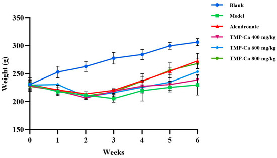 Effect of TMP-Ca chelates on body weight of model rats. Blank control: 0.9% saline; model: 0.9% saline + retinoic acid; positive control (alendronate): 5 mg alendronate/kg + retinoic acid; low dose of TMP-Ca: 400 mg/kg + retinoic acid; medium dose of TMP-Ca: 600 mg/kg + retinoic acid; high dose of TMP-Ca: 800 mg/kg + retinoic acid.